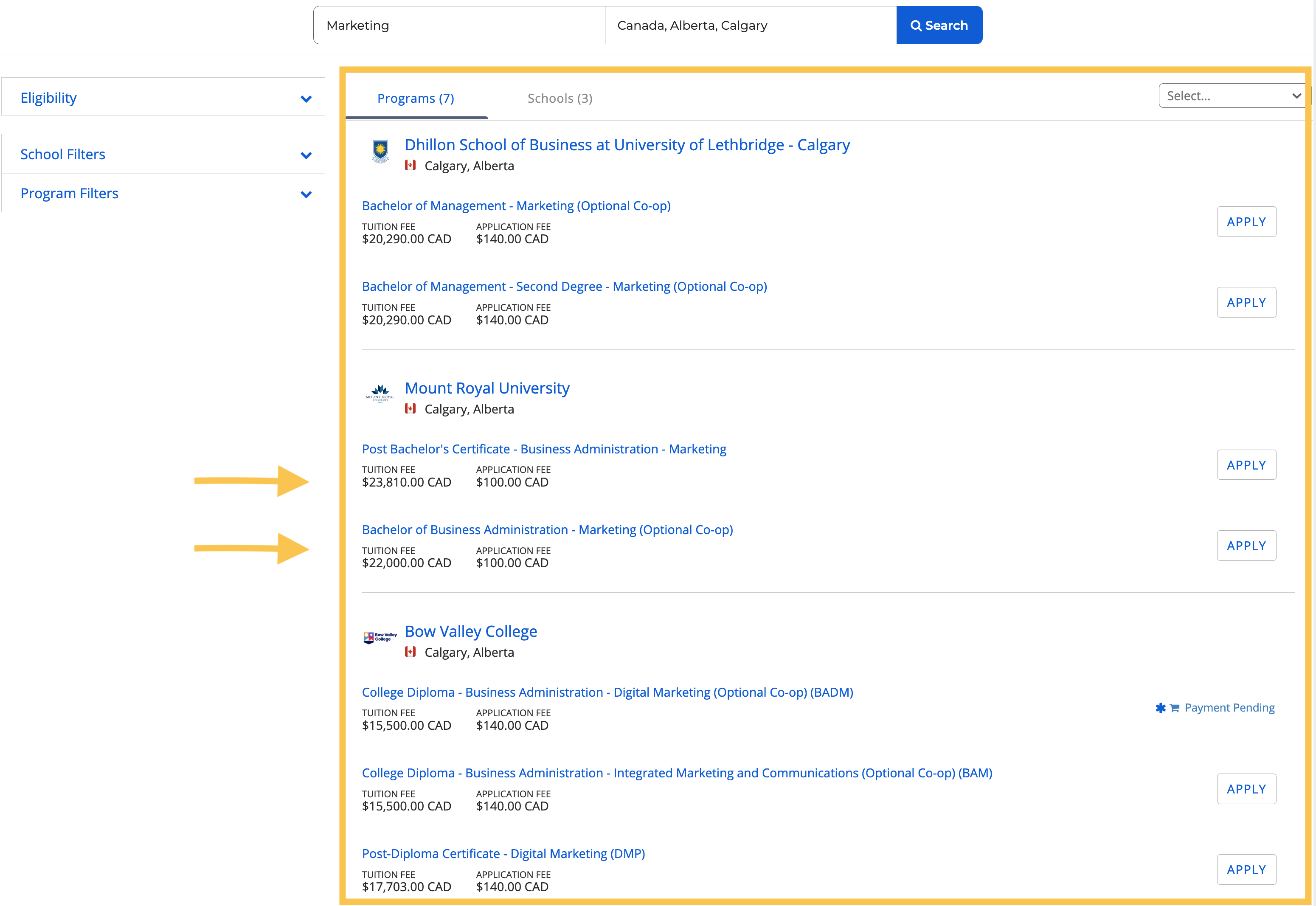 No exemplo a seguir, nós aplicamos alguns filtros de pesquisa por cursos e instituições de ensino no Canadá.