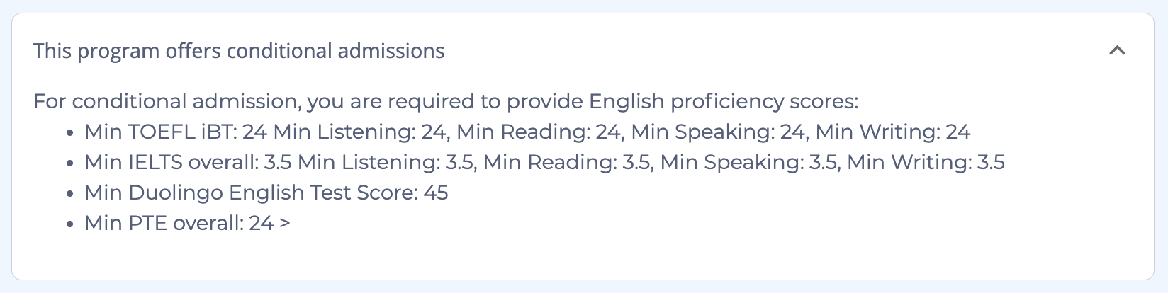 Na parte final da Área Laranja, ainda no mesmo exemplo, você encontra ainda a listagem de outros requerimentos para ingresso no curso. Observe que no exemplo em questão, o college exige notas mínimas específicas para cada um dos fatores do teste de idiomas: Listening, Reading, Writing e Speaking (ver imagem abaixo).