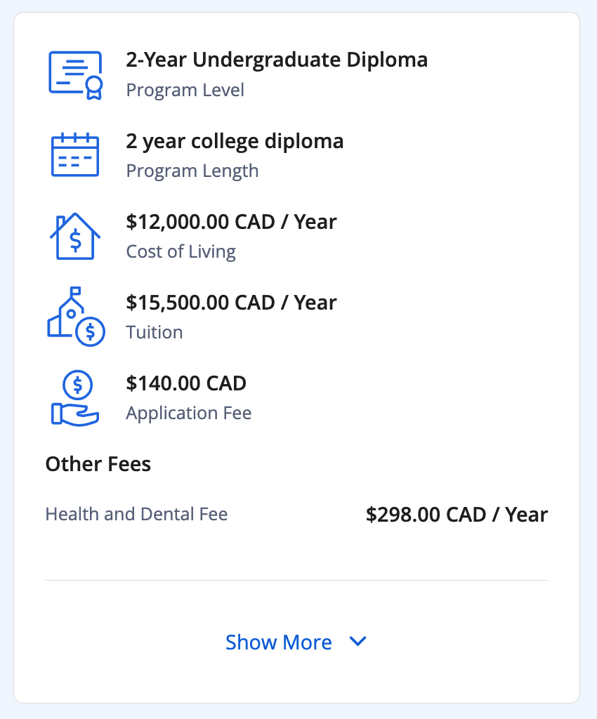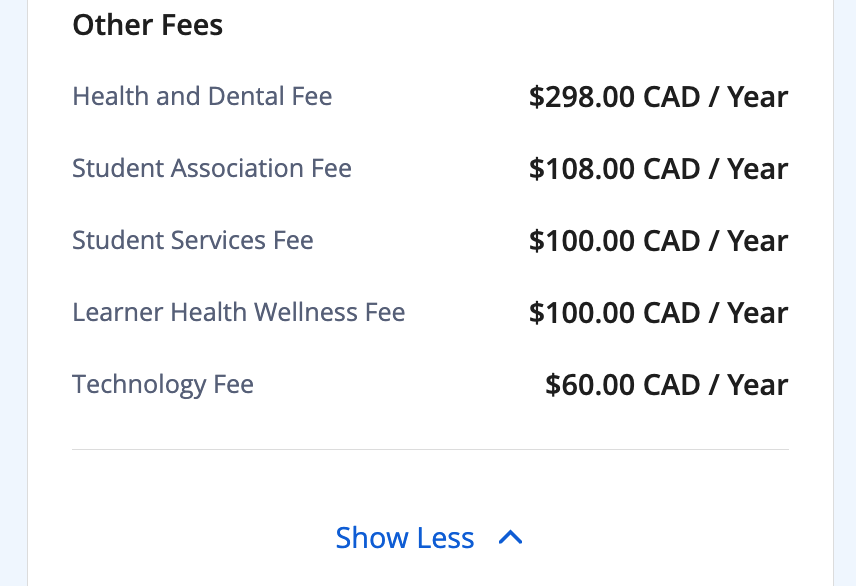Se você clicar em SHOW MORE, vai poder ver também outras taxas envolvidas no curso. São taxas cobradas pela própria instituição e elas podem variar de acordo com o curso e escola.
