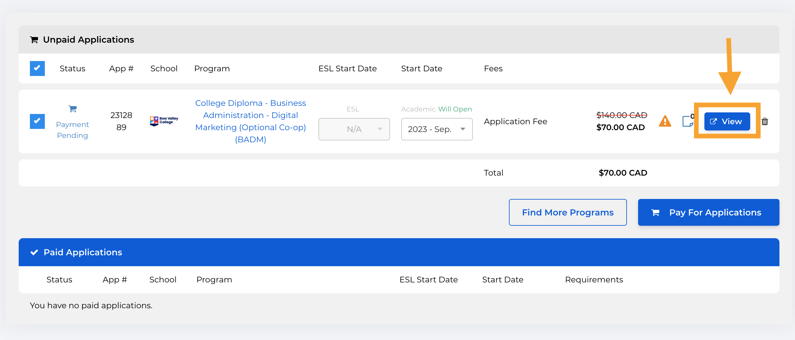 Ao clicar no link "My Applications" você verá suas aplicações de matrícula ativas no sistema (imagem abaixo). Note que no exemplo da imagem, a aplicação consta como "Unpaid" - ou seja, ainda não houve pagamento inicial do curso.