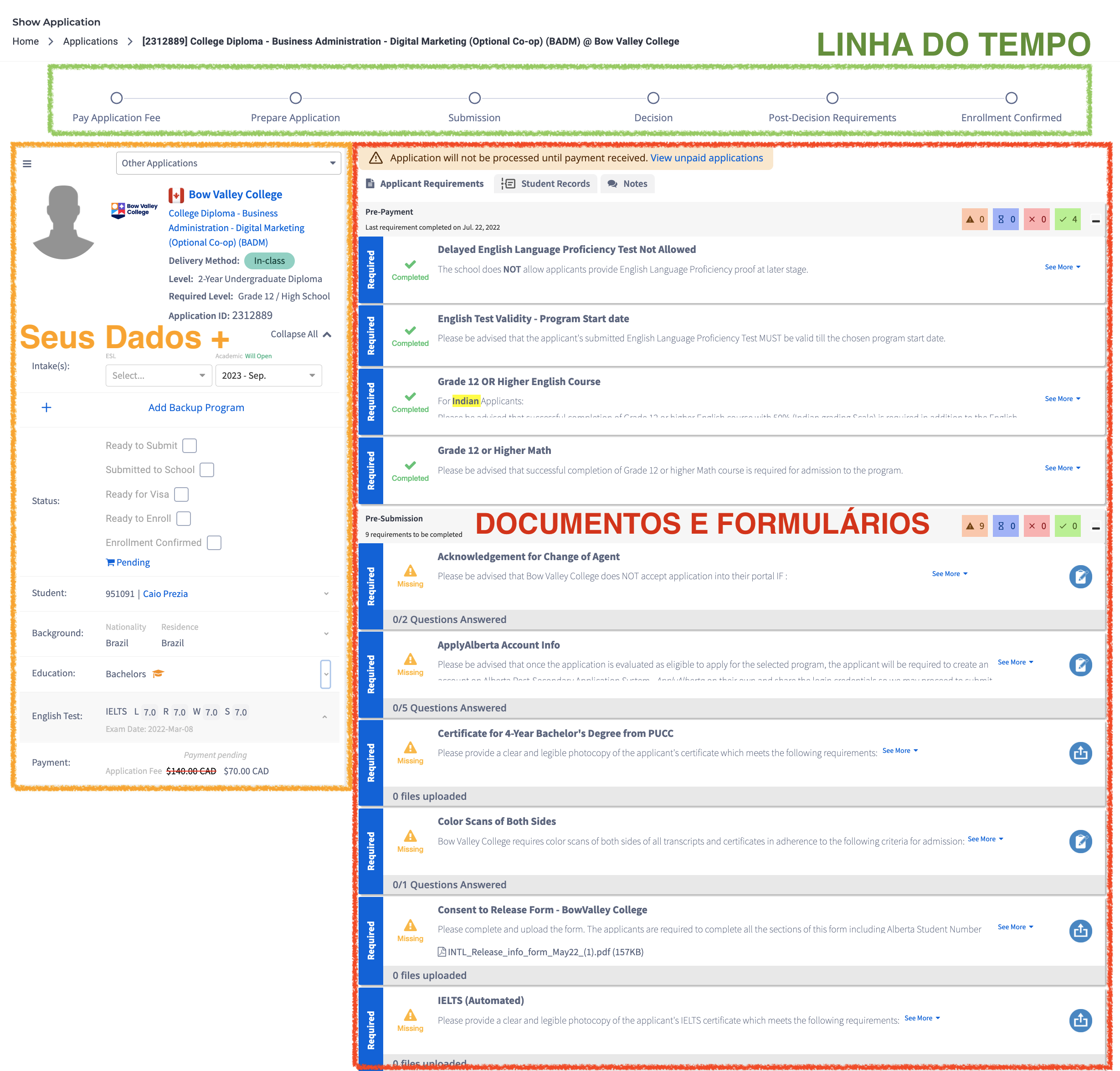 Observe que o sistema irá enviar a sua aplicação para a instituição de ensino Canadense somente após você efetuar o pagamento inicial. Note também que enquanto você não realiza o pagamento, os dados de sua aplicação podem ser corrigidos e atualizados no sistema.