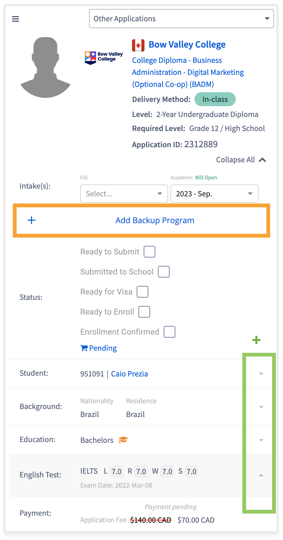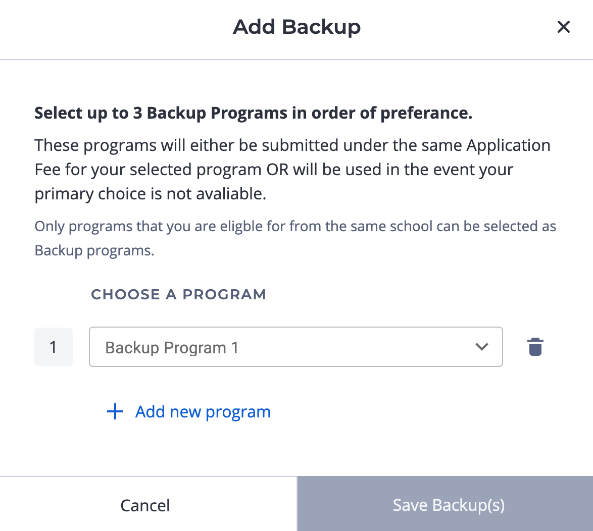 Add Backup Program: você pode adicionar programas de backup (ou seja, o seu ‘plano B’ de estudos) se por algum motivo a aplicação do seu curso falhar (por exemplo, as vagas se esgotaram e você não quer deixar de se matricular em um curso).