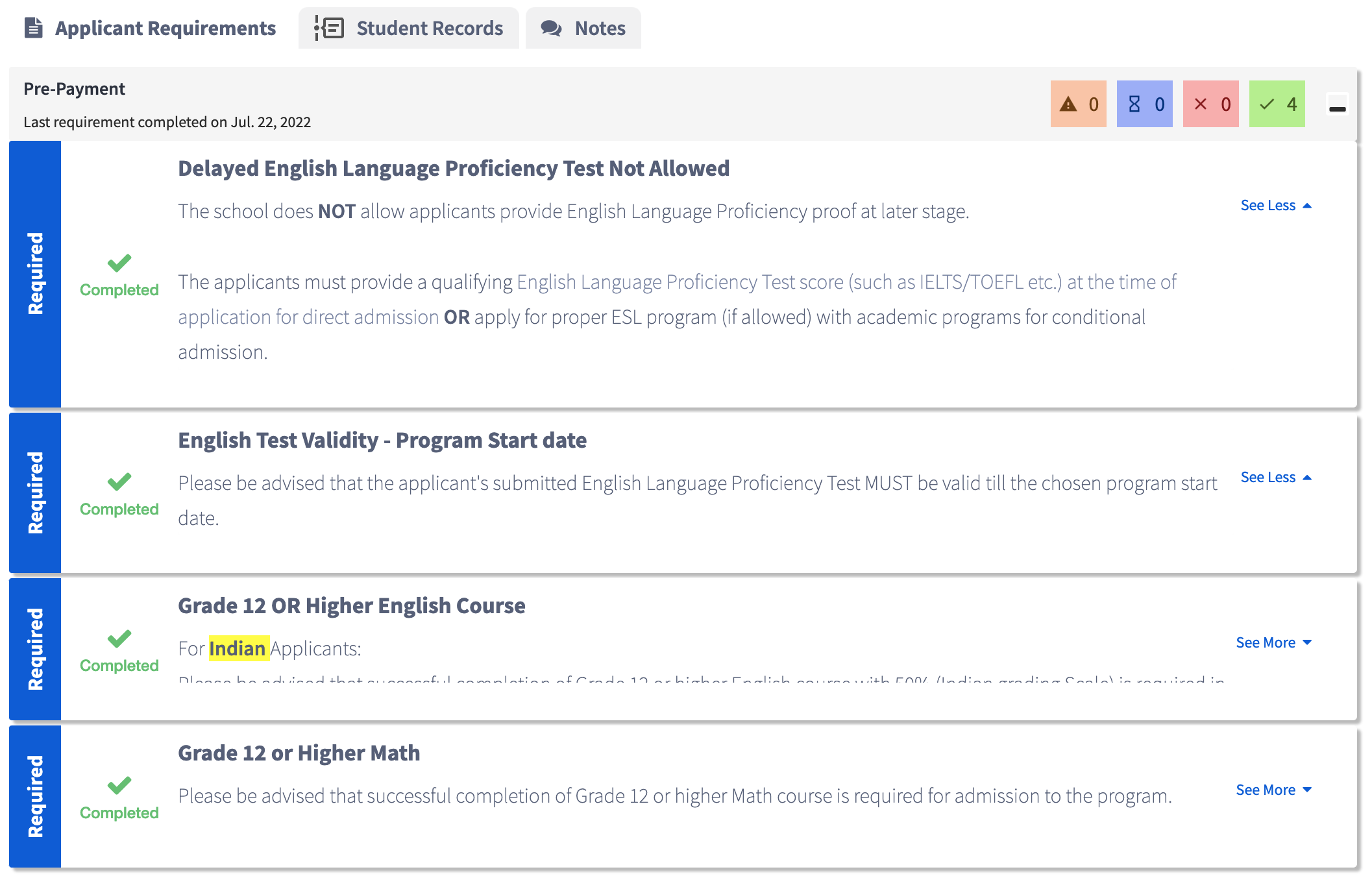 Uma última dica importante: fique atento à formatação dos documentos que serão enviados à instituição de ensino. Observe nas imagens acima que cada item possui uma tag "See More". Ao clicar na opção, o sistema exibe as diretrizes sobre como os documentos devem estar formatados.